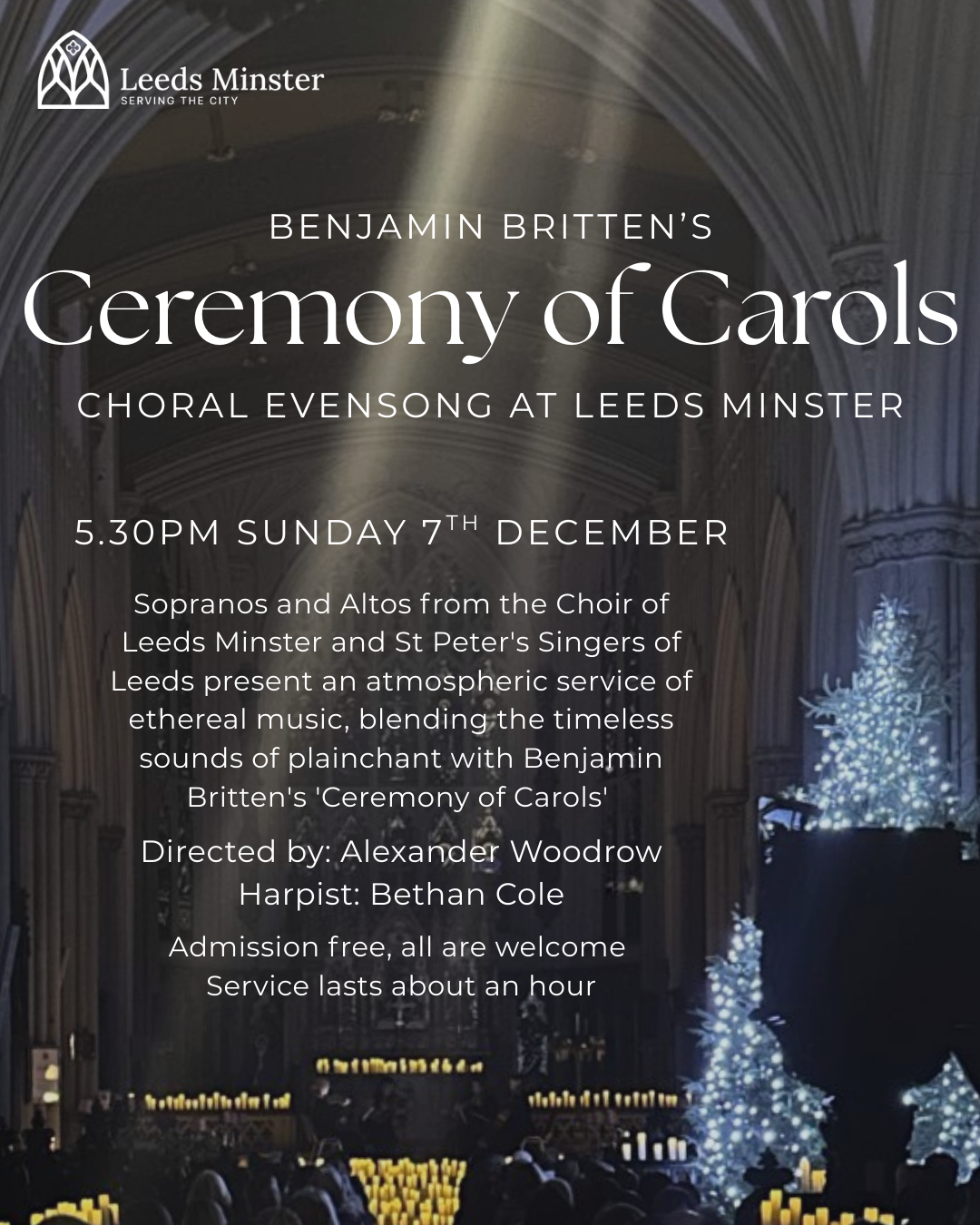 This service is sung by the upper voices of the Minster Choir, with members of St Peter’s Singers. The Britten anthem is accompanied on the harp by Bethan Cole.